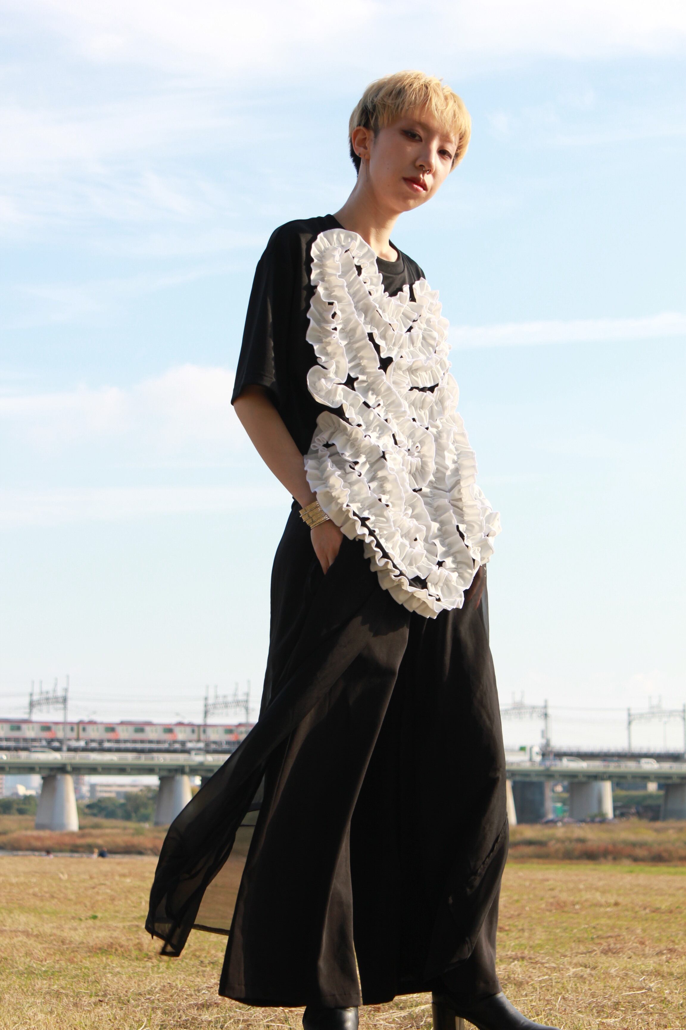 内臓のように縫い付けたフリルが前面に広がる